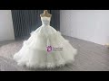 Omnipresent grace and style define this breathtaking wedding dress. The clean, strapless bodice crafted from high-quality satin exudes a timeless elegance that complements the playful, layered skirt. The voluminous tulle skirt features rows of delicate feathers, adding a touch of whimsy and sophistication to the overall design. This unique combination of textures and materials creates a stunning silhouette that is both modern and romantic. Perfect for the bride who wants to blend classic beauty with contemporary flair, this gown will make you feel like the star of your own fairy tale. As you glide down the aisle, the feathers will flutter gracefully, creating a mesmerizing effect that will captivate all who witness it. This dress is designed to make your wedding day truly magical and unforgettable.